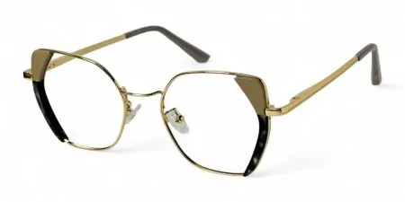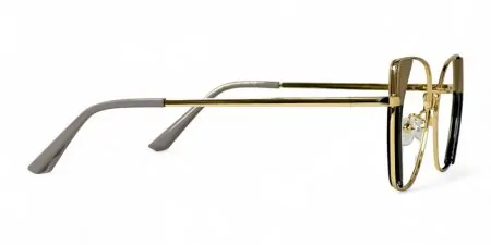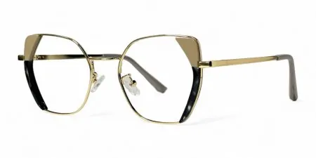 Elaris Geometric Glasses in Gold Metal with bold black accents, designed with a sleek fit for a confident and stylish look. These frames balance durability with fashion-forward design, making them perfect for everyday wear and modern sophistication.