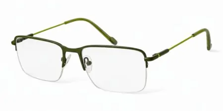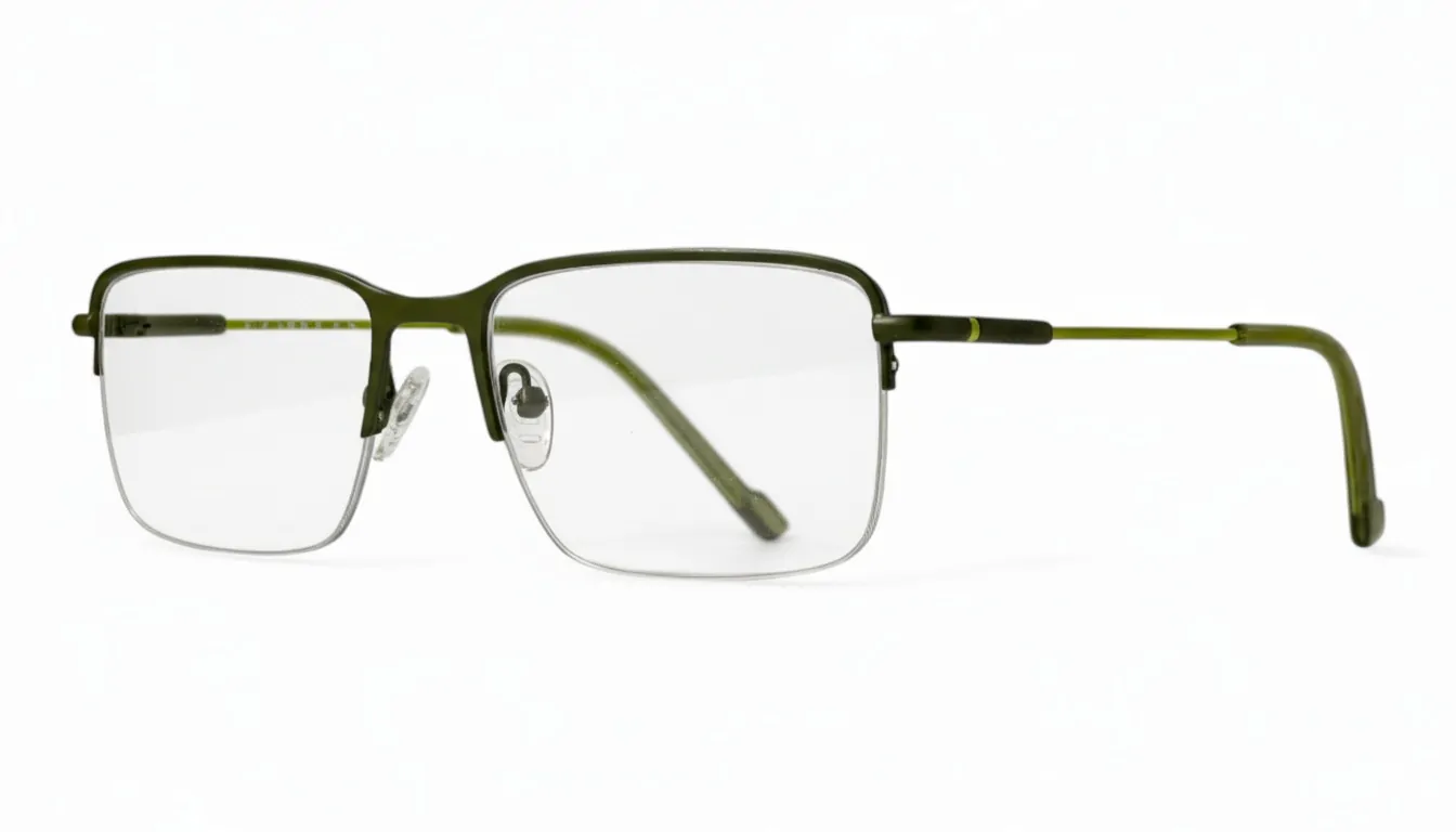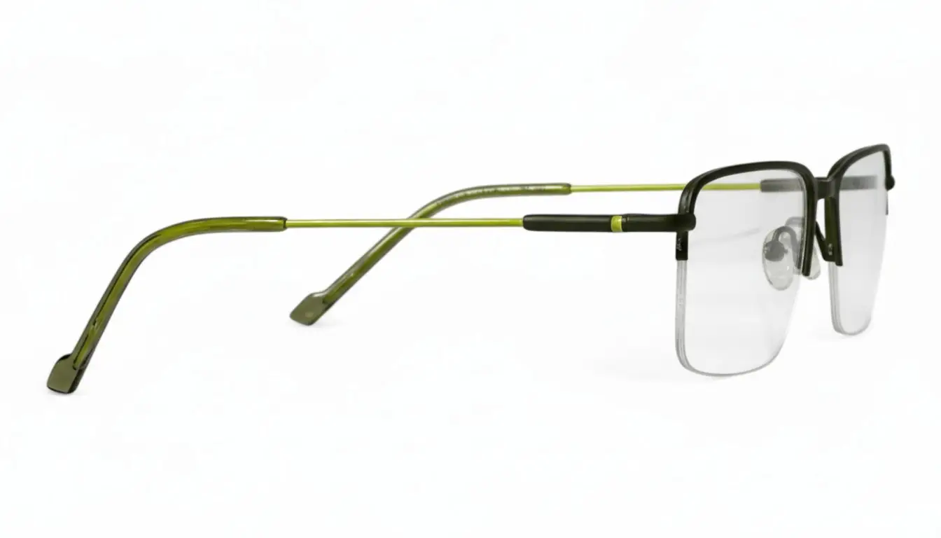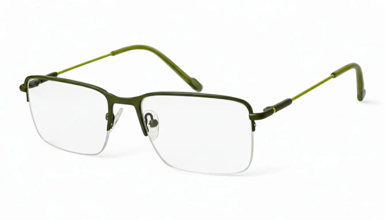 Selrin Rectangle Half Rim Glasses in Green Metal, designed with a sleek and professional aesthetic. These frames provide lightweight comfort and durability, making them ideal for everyday wear in both office and casual settings.